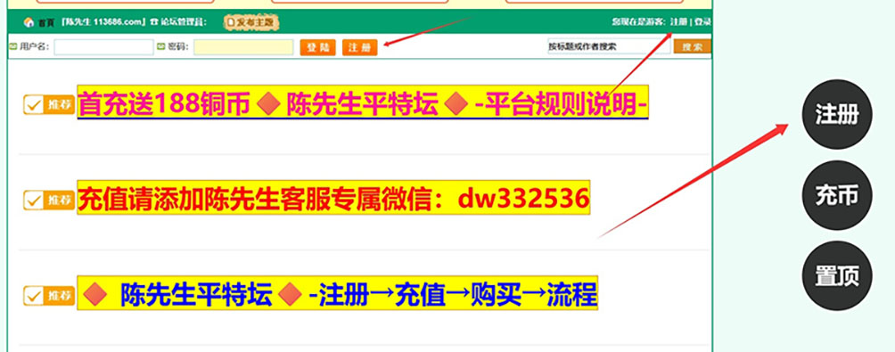 首先点击注册用户名,然后联系陈先生平特坛客服微信索要银行帐号或者支付宝转帐充值金币,客服把相应金额的金币充入你注册用户名的金币账户,充值金币后,点击您查看的高手资料帖子,然后点“我要购买,打赏后即可查看隐藏资料”,系统会自动扣除相应金币您便获得高手资料。